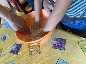 Het is supersimpel: Je kneedt zelf het deeg (gewoon simpel wit brood deeg volstaat, een pak bij de supermarkt vandaan waar je bijv. alleen water en boter aan toevoegt), dan ontvang je de jongens. Lekker wat limonade en een lekkere koek/snoepje/taartje/verzin maar wat. Hier bijv. recept van volkoren pizza, maar gewoon wit brood kan ook, dan vervang je de volkoren mix door bloem. Je kunt ook het kind zelf laten kneden, maar je moet echt wel 20 minuten kneden en meestal zijn ze het na 2 minuten al zat. Om die reden gebruiken we de broodbakmachine ervoor en heeft Peter 1 deel samen met een jongen gekneed, die had er echt lol in :)...